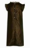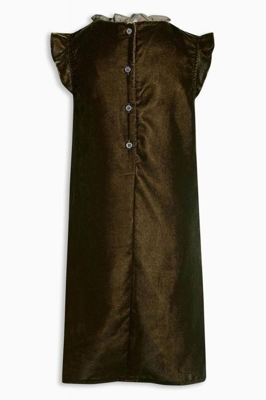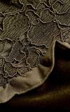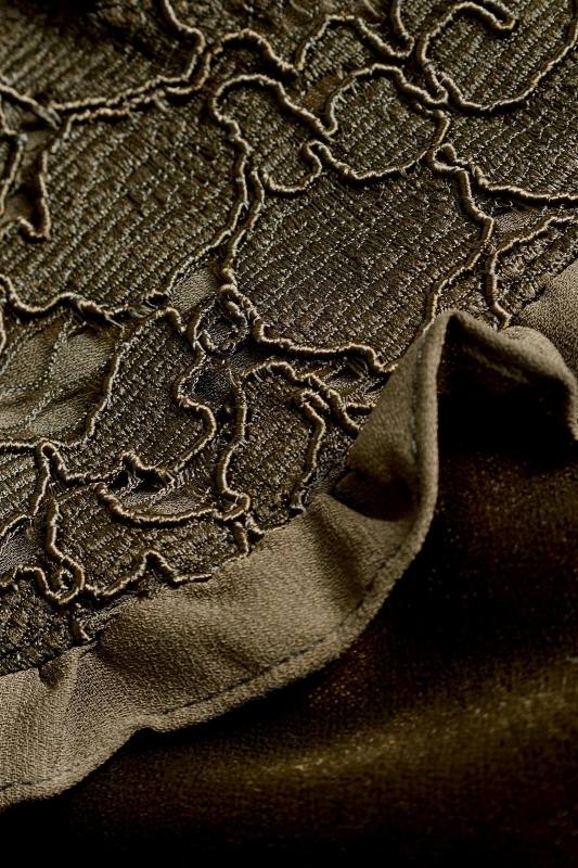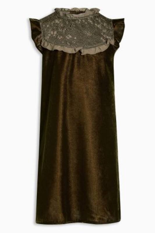 Moderné velúrové sviatočné šaty, farba olivovo-zelená až khaki. Krásne zdobené čipkou v hornej časti, jemné volány na rukávoch a po okrajoch čipky.