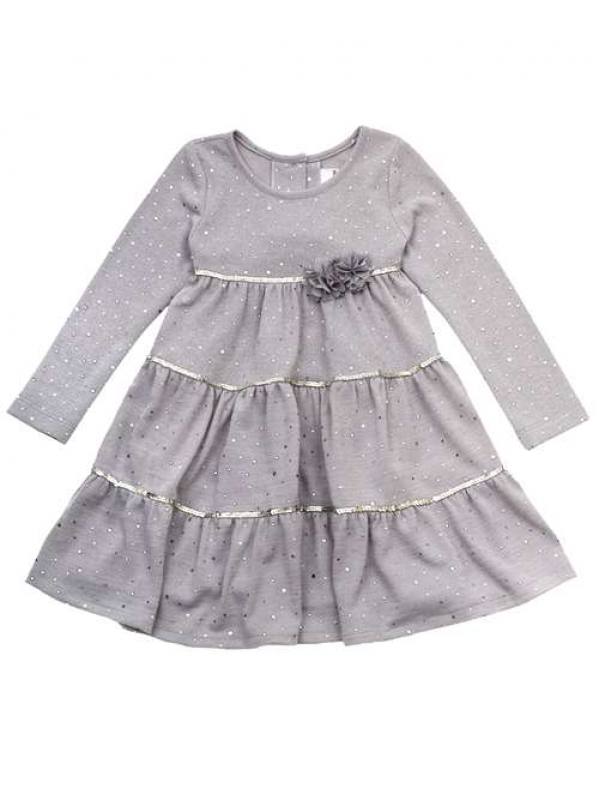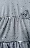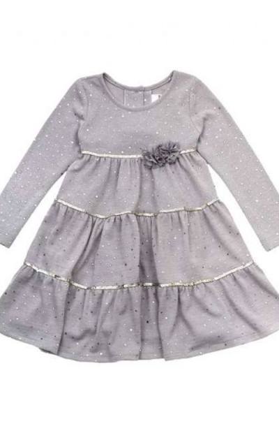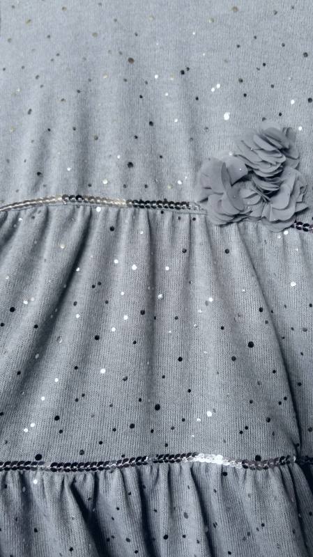 Pohodlné pletené šaty s 3D kvetmi, svetlošedá farba, strieborné flitre, šnúrka na stiahnutie vzadu, A-strih. Šaty sú využiteľné celoročne na všetky slávnostné príležitosti.