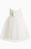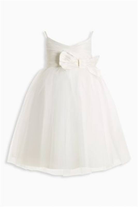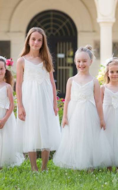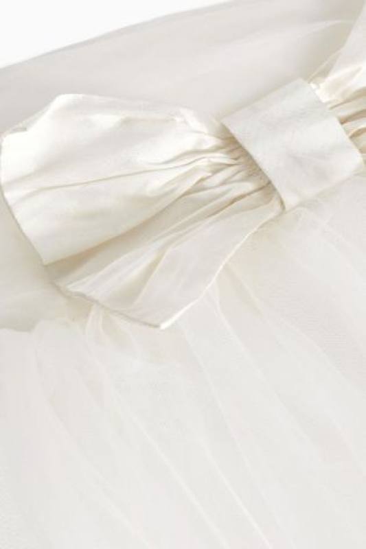 Jemné sviatočné šaty oživené vpredu hodvábnou mašľou, kombinácia bielej a svetlého odtieňa ivory.
