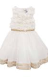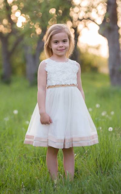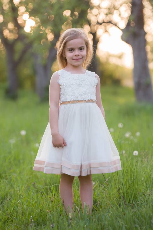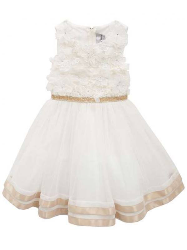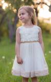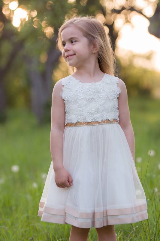 Sviatočné šaty Chantilly Place vhodné na všetky sviatočné príležitosti. Základ maslový (ivory) so zlato-medenými ozdobami, top bohato zdobený kvetmi a kamienkami, na vyvýšenom páse kamienky a flitre a vzadu stuha na uviazanie, sukňa dolu lemovaná medeným saténom.