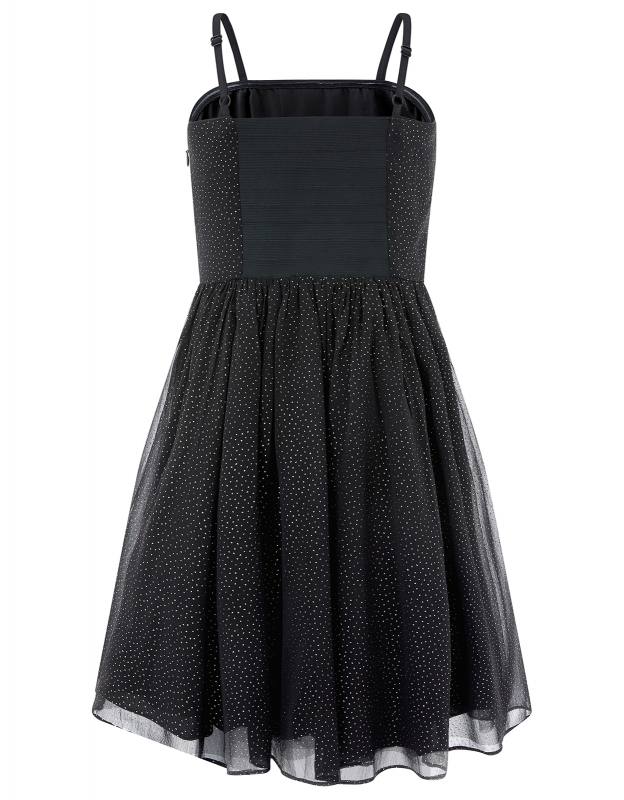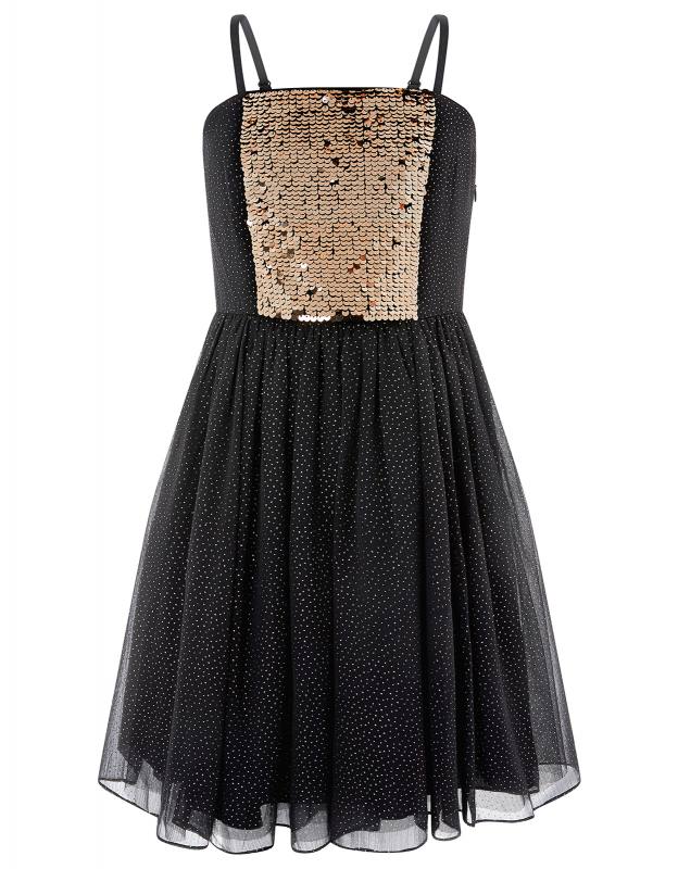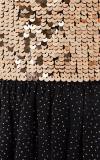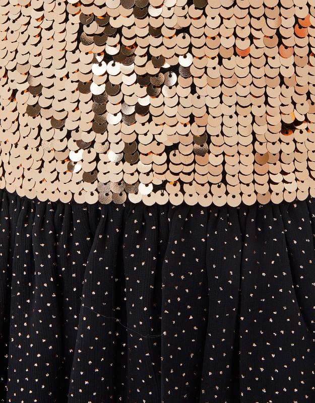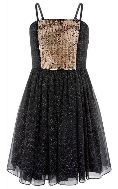 Sviatočné šaty pre veľkú slečnu, kolekcia Storm, celé posiate zlatými bodkami, top zdobený zlatými flitrami, nastaviteľné ramienka, na chrbte guma.