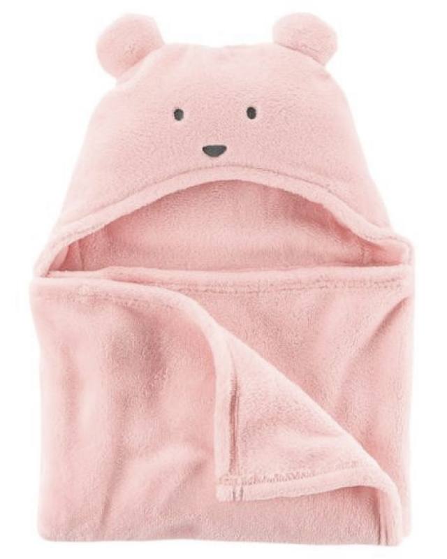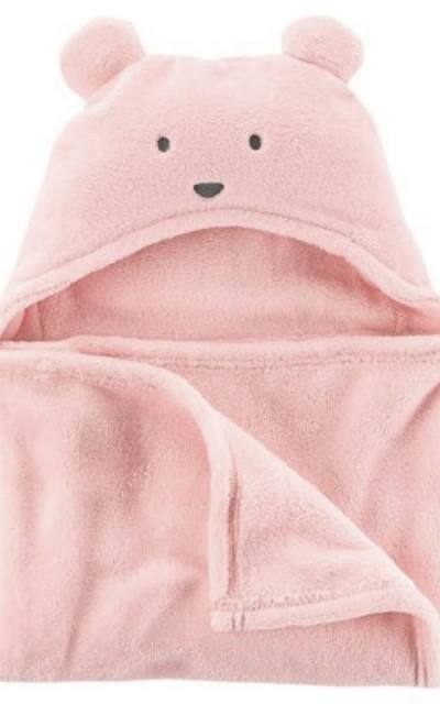 Veľká deka s kapucňou s uškami, mäkký chlpatý materiál (sherpa), farba jemná bleduružová. Deka je vhodná od cca 8-9 mesiacov až po juniorský vek.